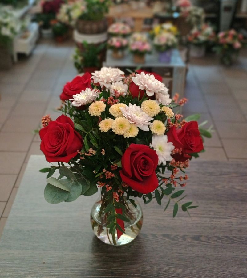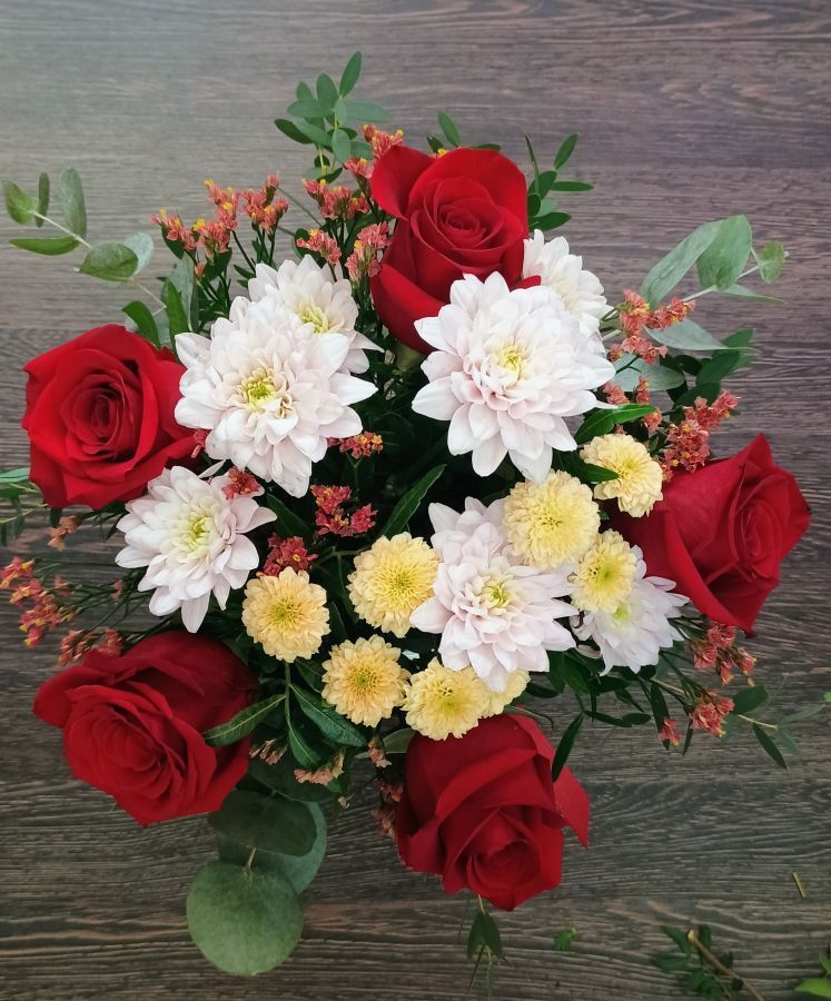 7x bílá chrazyntéma, 9x růže rudá, zeleň.